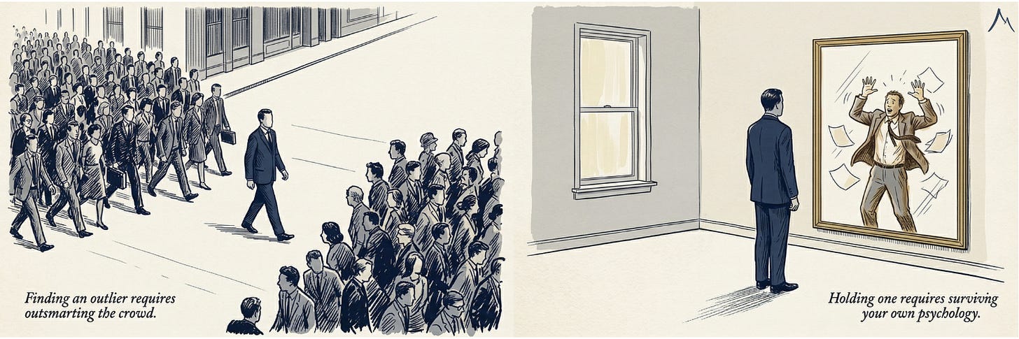 Finding an outlier requires outsmarting the crowd. Holding one requires surviving your own psychology.