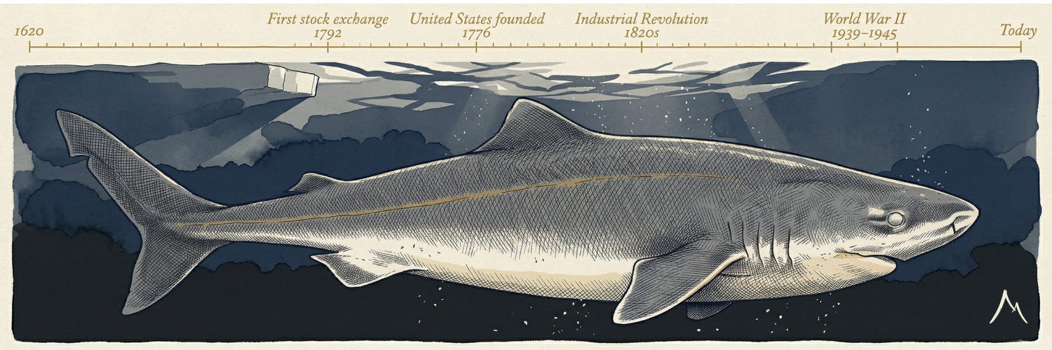 In 2016, a marine biologist pulled a Greenland shark from the freezing waters of the North Atlantic. Radiocarbon dating of its eye tissue revealed that the animal was nearly 400 years old.