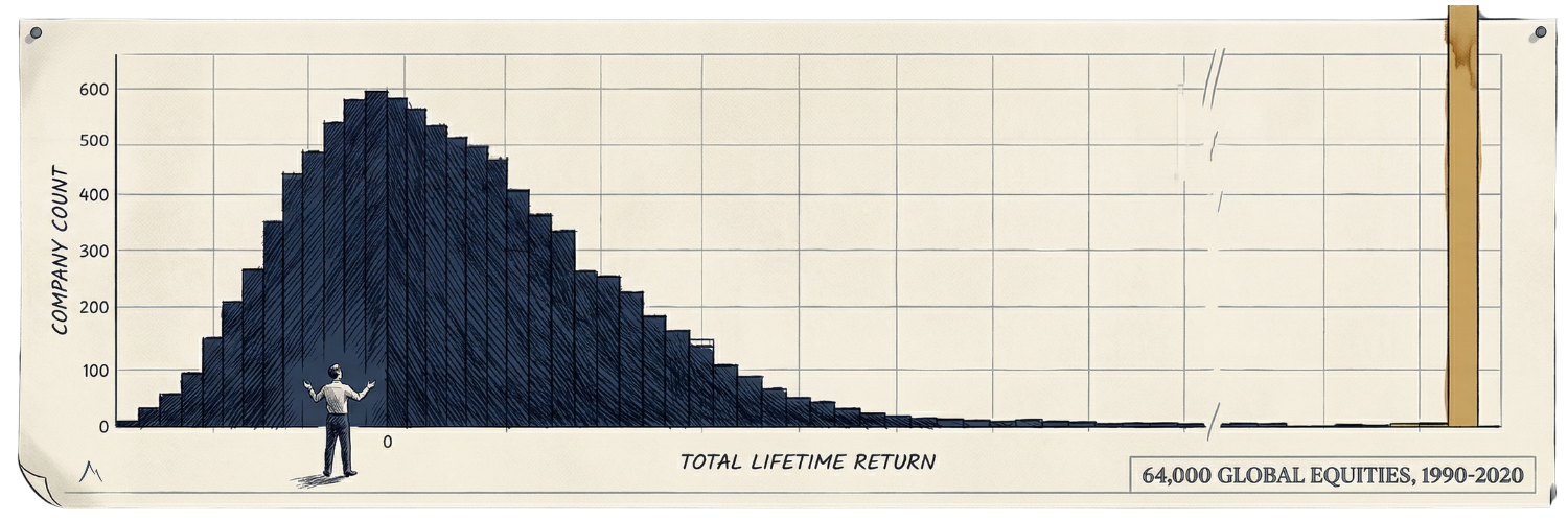 Research by Arizona State University professor Hendrik Bessembinder, covering 64,000 global equities from 1990 to 2020, uncovered a stark reality. For most individual common stocks, the most frequent outcome over a lifetime is a 100% loss. Capital is not merely underperforming. It is vaporized.