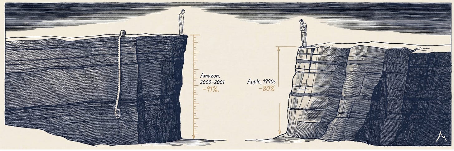 The journey is never a straight line. Apple stock fell 80% in the 1990s and suffered three separate 70% drawdowns on its way to becoming a dominant ecosystem. Amazon lost 91% of its value between February 2000 and September 2001.