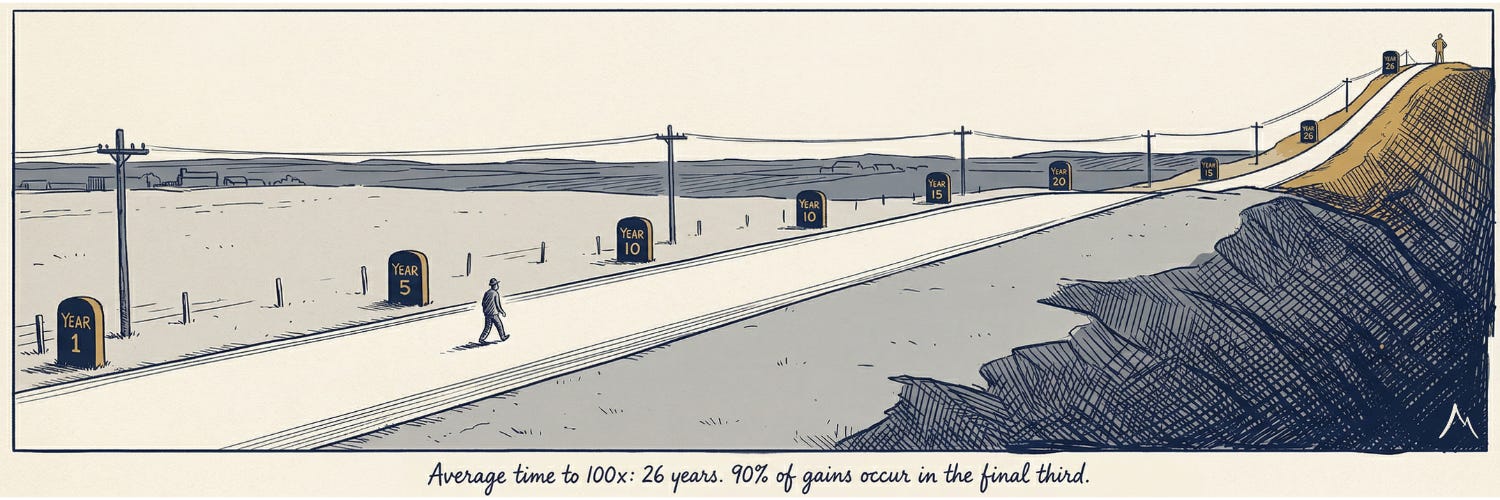 Achieving outlier status is fundamentally a test of duration. There is no shortcut that bypasses the mathematics of time. Author Chris Mayer studied every 100x-returning stock from 1962 to 2014 and found that the average time required to hit that milestone is 26 years. Even the absolute fastest-growing companies in history required nearly two decades of sustained 26% annualized returns to cross the finish line.